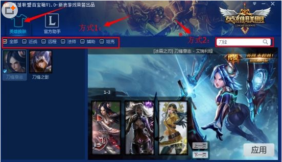 首先通過下圖兩種方式進(jìn)行快速查找到你要換的英雄皮膚。
