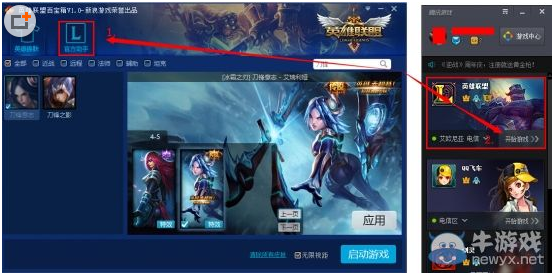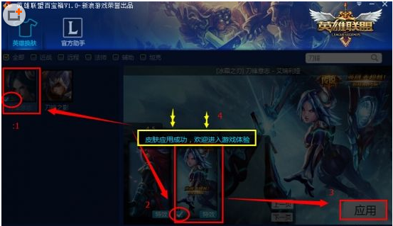 如下圖,在軟件端點(diǎn)擊1,開啟騰訊游戲助手;點(diǎn)擊2,進(jìn)入游戲窗口,在加入隊(duì)伍后,選擇好在游戲中的英雄,不要點(diǎn)擊確定,此時返回工具上,找到對應(yīng)英雄皮膚,點(diǎn)擊應(yīng)用,提示應(yīng)該成功,再切換到游戲窗口,皮膚就這樣加載完成啦。