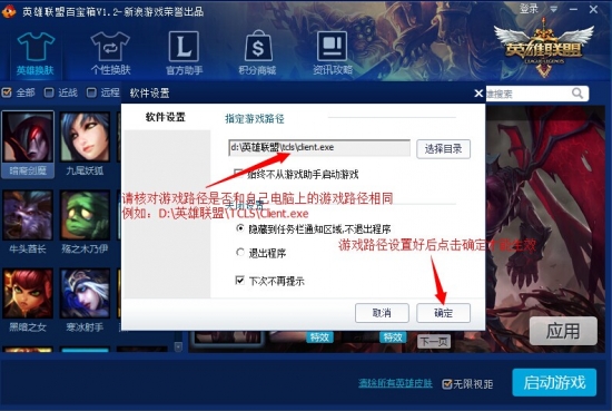 4.具體使用方法為:直接“啟動游戲”需要提前點(diǎn)擊軟件右上方倒三角按鈕,在軟件設(shè)置中,選擇好本地游戲安裝目錄下方的文件 Client.exe 參考游戲目錄=英雄聯(lián)盟\tcls\client.exe