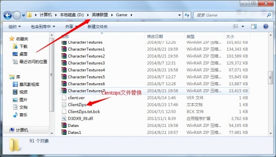 2、清除所有個性皮膚無效,請到游戲目錄下的“英雄聯(lián)盟\Game”文件里的ClientZips換成游戲默認(rèn)文件