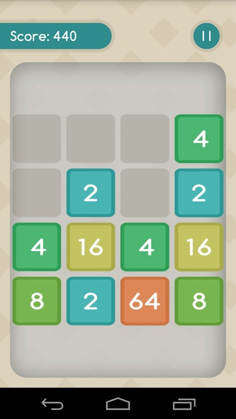 3、被加數(shù)移動要少(我通常都是放在最左上角,這樣比較保險,如果計算能力特別強,這個到無所謂),用低級根創(chuàng)造高級根,且根要有連續(xù)性。舉例:被加數(shù)到512時,你的圖上最好要有256(之前使用低級根加上來的)、128、64、32。這樣數(shù)字相加后留下的空間就多,就不容易結(jié)束游戲。所以這個游戲其實是一個靠「準備」通關(guān)的游戲,意思就是你湊出512之前不要急,先把各個根給湊出來。