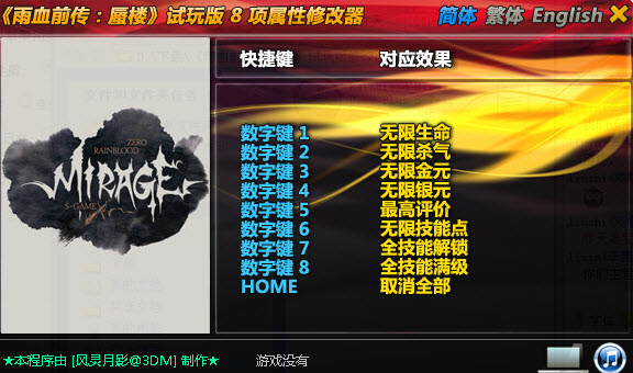 雨血前傳蜃樓修改器是為同名動作游戲提供的輔助作弊工具,可以帶給玩家無限生命、殺氣、金錢等多種功能,幫助玩家在游戲中有更好的發(fā)揮。