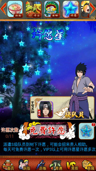 6、奇遇系統(tǒng):在口袋忍者內(nèi)歷練、開啟寶箱、參與活動(dòng)等操作都有幾率觸發(fā)奇遇,奇遇有很多種,目前開放了一樂拉面、搶奪殘卷、許愿、探險(xiǎn)