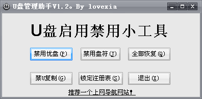 U盤管理助手是一款多功能U盤應(yīng)用工具。它頁面清晰,操作簡單。對(duì)應(yīng)功能頁面一鍵就可以解決問題。支持禁止優(yōu)盤、禁止盤符、全面恢復(fù)、禁止復(fù)制、鎖定注冊表5項(xiàng)功能。歡迎下載使用!