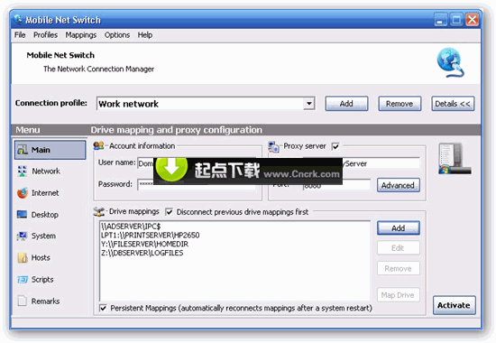 Mobile Net Switch是一個(gè)可以在筆記本電腦中使用的網(wǎng)絡(luò)轉(zhuǎn)換工具!一個(gè)可以迅速改變IP及多項(xiàng)設(shè)置的利器,它可以將你每個(gè)不同的網(wǎng)絡(luò)環(huán)境建立一個(gè)參數(shù)配置文件(profile),到某個(gè)網(wǎng)絡(luò)的時(shí)候,還原(restore)為相應(yīng)的配置文件即可,無需重啟。它可以設(shè)置多個(gè)選項(xiàng),包括驅(qū)動(dòng)器的正確鏡像,默認(rèn)打印機(jī)的設(shè)置,代理服務(wù)器及IP地址等等