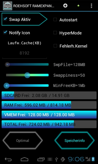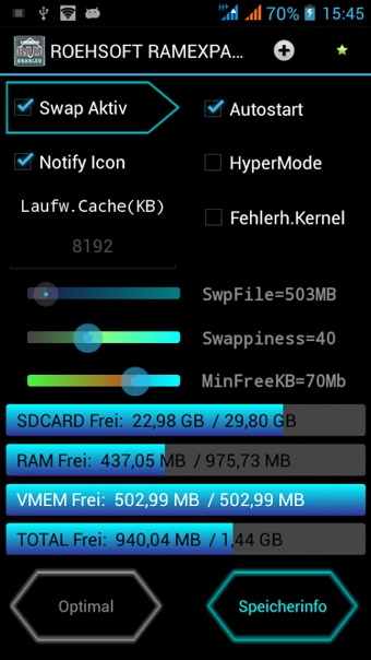 內(nèi)存擴(kuò)展ROEHSOFT RAM-EXPANDER (SWAP)可以將手機(jī)的內(nèi)存擴(kuò)展為ram來使用,這樣可以運(yùn)行更多的程序,而不是使用任務(wù)殺手或內(nèi)存優(yōu)化。內(nèi)存擴(kuò)展ROEHSOFT RAM-EXPANDER (SWAP)可以將手機(jī)的內(nèi)存擴(kuò)展為ram來使用,這樣可以運(yùn)行更多的程序,而不是使用任務(wù)殺手或內(nèi)存優(yōu)化。【軟件特色】