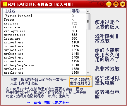 殘葉無視創(chuàng)世兵魂投訴器是在您在使用殘葉輔助被封號時,用到的一款解封軟件,它可以百分百防止您使用外掛時被系統(tǒng)封號。讓您游戲玩的開心,輔助用的安心,歡迎下載使用
