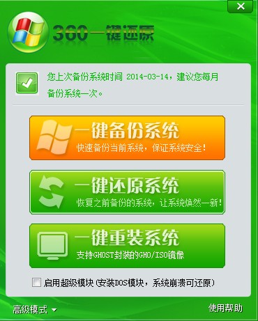 360一鍵ghost是一款電腦系統(tǒng)備份還原的系統(tǒng)軟件。安裝好此軟件,然后選擇一個(gè)系統(tǒng)最佳狀態(tài)時(shí)間,然后點(diǎn)擊一鍵還原,在之后如果系統(tǒng)遇到問題,或者中病毒等等,便可打開本軟件一鍵輕松還原系統(tǒng),解決問題,又回到一個(gè)干凈健康的系統(tǒng)。