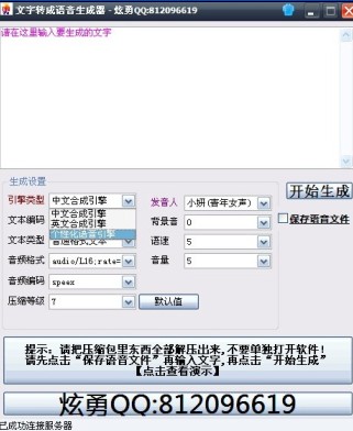 使用語音自動生成器轉(zhuǎn)換語音之前可自定義引擎類型、文本編碼、文本類型、音頻格式、音頻編碼、壓縮等級、發(fā)音人、背景音、語速、音量等選項。通過該軟件制作免費的語音可以用作mc喊麥說話開場,也可以錄制文字表白情書。生成的語音文件在軟件運行目錄!