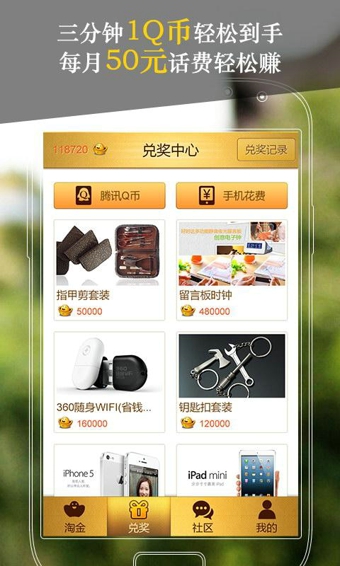 3分鐘1Q幣輕松到手,花錢充QQ會員的都弱爆了;每月50元話費輕松賺,媽媽再也不用擔(dān)心我的手機(jī)停機(jī)了!淘金大廳:試玩精品游戲,體驗炫酷應(yīng)用,賺取金豆獎勵。