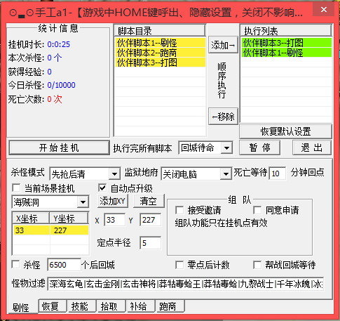 全自動(dòng)智能刷怪、跑商、打圖、采集、種植、副本、任務(wù)、搶打造圖等,各個(gè)腳本相互獨(dú)立,可自行添加N個(gè)腳本,將按順序全自動(dòng)執(zhí)行。智能防卡地圖。