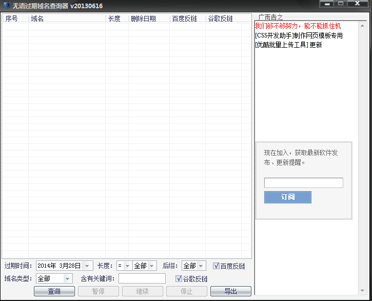 無(wú)語(yǔ)過(guò)期域名查詢器是一款簡(jiǎn)單實(shí)用用的過(guò)期域名查詢軟件。軟件可以根據(jù)域名過(guò)期指定日期、長(zhǎng)度篩選、類型、關(guān)鍵詞、百度反鏈、GG反鏈進(jìn)行查詢。操作簡(jiǎn)單,查詢速度快。是您搶注火熱域名的好幫手。