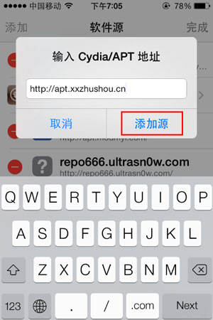 2.點(diǎn)擊進(jìn)入“軟件源”,點(diǎn)右上角的“編輯”按鈕進(jìn)入軟件源界面,然后點(diǎn)左上角的“添加”,出現(xiàn)輸入地址界面,輸入“apt.xxzhushou.cn”后點(diǎn)“添加源”,Cydia會(huì)進(jìn)入查找并下載更新源包過程。
