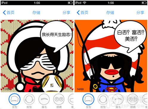 只需要左右滑動(dòng),就可以完成拼臉。跟imadeface和uface、魔漫相機(jī)、QQshow的操作一樣簡單。
