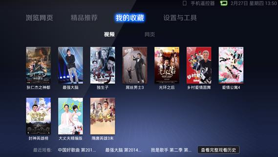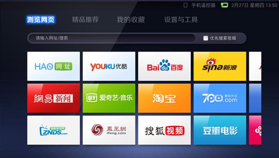 通過(guò)遙控器,可以輸入網(wǎng)址隨意訪(fǎng)問(wèn)任意站點(diǎn)、瀏覽精選站點(diǎn)以及在搜索框優(yōu)先搜索視頻全新高清磁貼界面,兼容多種類(lèi)型設(shè)備與分辨率,配合遙控器操作更便捷