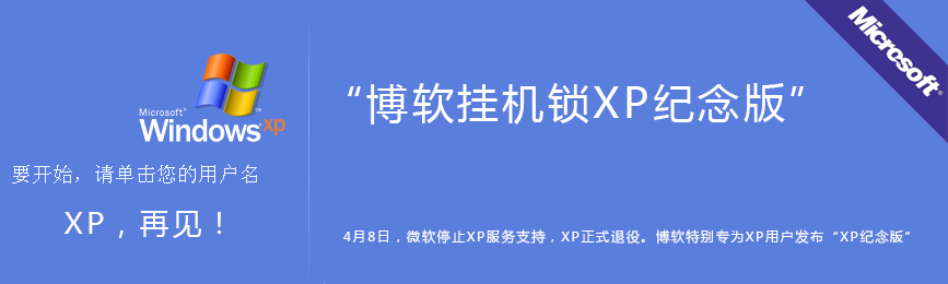 博軟掛機(jī)鎖XP紀(jì)念版是專為即將停止更新服務(wù)的XP忠實(shí)用戶提供的電腦掛機(jī)鎖,掛機(jī)鎖官方免費(fèi)下載可以幫助用戶在離開(kāi)電腦的時(shí)候自動(dòng)鎖定屏幕,還可以設(shè)置注銷、鎖定計(jì)算機(jī)操作是否執(zhí)行,非常適合家庭、學(xué)校等使用。