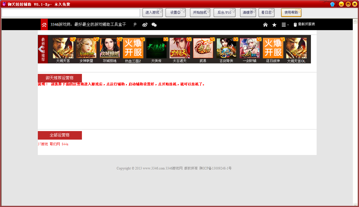 支持37游戲、哥們網(wǎng)、844a三大運營商,開啟輔助后,選擇相應(yīng)的運營商進(jìn)入游戲,點運行輔助,啟動輔助設(shè)置好,點開始掛機,就可以掛機了。