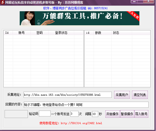 1、使用軟件需要一批網(wǎng)易論壇帳號(hào),請(qǐng)用戶提前預(yù)備好帳號(hào)。