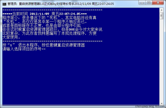 1:程序的主界面,如果按1則退出本程序,按任意鍵進(jìn)行重啟資源管理器的操作