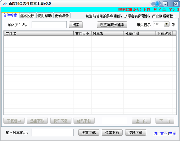 百度網(wǎng)盤搜索器可以搜索到任何類型的文件,無論是電影、視頻、文檔、小說、軟件等,內(nèi)置網(wǎng)盤解析和下載地址轉(zhuǎn)換子程序,可以通過迅雷等工具快速的下載到你的電腦上。百度網(wǎng)盤搜索器還支持顯示文件的各種信息,包括文件名,文件大小,分享者,分享時(shí)間,下載次數(shù)一目了然。