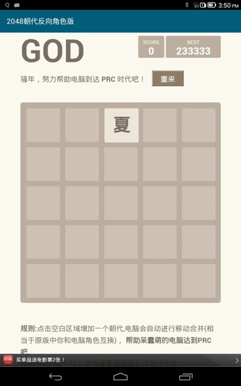2048朝代反向角色版是一個(gè)基于2048修改而來的游戲。是不是覺得玩朝代版太累了,被電腦虐的死去活來?現(xiàn)在報(bào)仇的機(jī)會(huì)來了,2048朝代角色互換版本隆重出現(xiàn),點(diǎn)擊空白方塊來增加一個(gè)朝代,電腦會(huì)自動(dòng)移動(dòng)方塊合并,你就是上帝,快來虐電腦吧