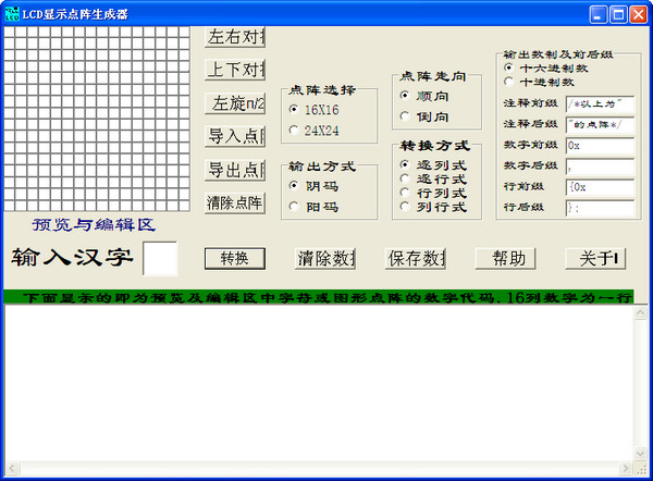 2.本程序可直接輸入16*16的漢字,16*8的ASCII碼,24*24的漢字,輸入字符后,它的點(diǎn)陣圖形隨即顯示在柵格區(qū)內(nèi);