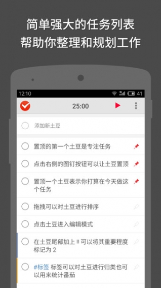 番茄土豆是番茄工作法和 To-do List 工具,它可以幫助你計劃、管理、執(zhí)行、記錄工作?,F(xiàn)在就開始使用番茄土豆,完成了不起的工作!* 結(jié)合番茄工作法和 GTD