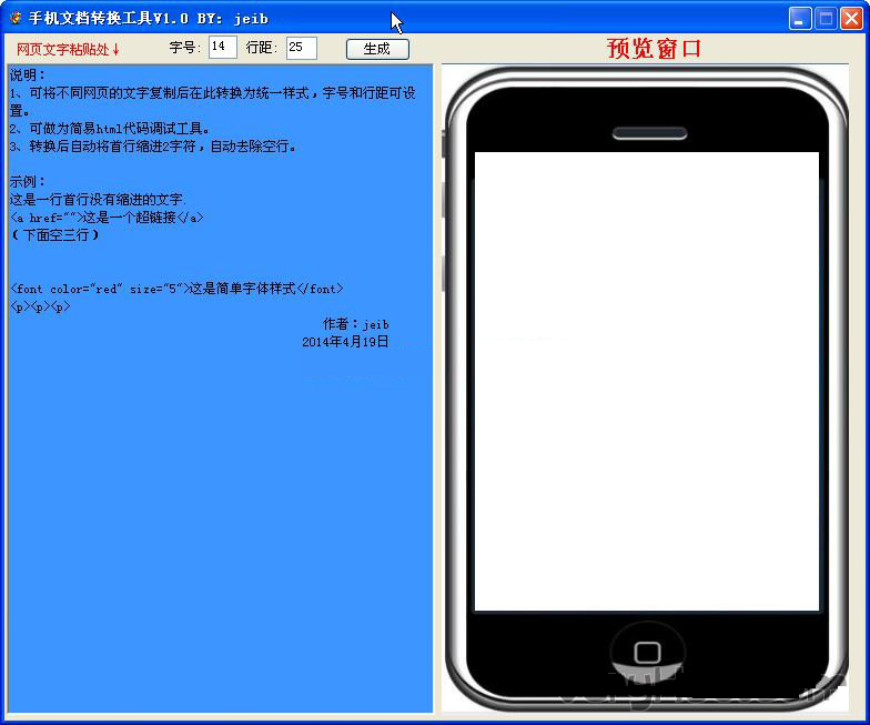手機(jī)文檔樣式轉(zhuǎn)換器是用于轉(zhuǎn)換手機(jī)文檔的一款工具。軟件頁面簡潔,操作簡單。你只需將需要轉(zhuǎn)換的內(nèi)容輸入,就會自動跳轉(zhuǎn)成網(wǎng)頁預(yù)覽格式,可以預(yù)覽效果,歡迎下載使用。