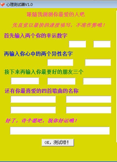 心理測試器是一款娛樂測試小工具。它可以測試你的幸運數(shù)字,你心中的兩個異性名字,你最喜歡的三個朋友,你最喜愛的四首歌曲等等。工作太累的時候,閑暇無聊的時候,可以拿出工具好好測試,瞬間你就會有生活很美好的感覺。
