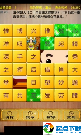 《成語消除》是一款超級(jí)好玩,寓教于樂的文字益智游戲。你只要按順序選中一個(gè)成語的四個(gè)方塊,這些方塊就會(huì)消除。美麗的界面,簡(jiǎn)單易上手的操作,耐玩有趣的挑戰(zhàn),它絕對(duì)是你閑暇時(shí)候的好伴侶。游戲分為普通篇和困難篇,一共多達(dá)50關(guān),你需要在規(guī)定時(shí)間不斷挑戰(zhàn)你的漢語水平,準(zhǔn)備好了嗎?【游戲特色】