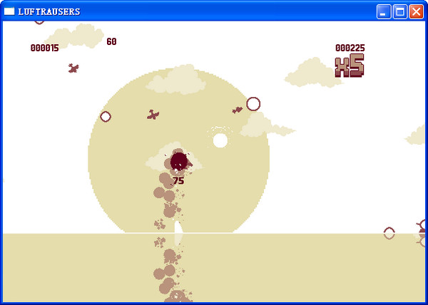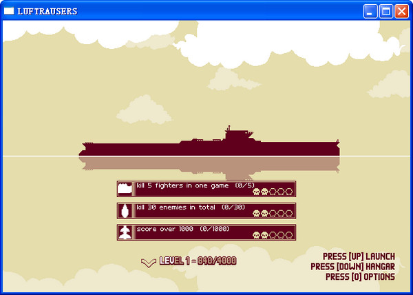 玩家的飛機(jī)從潛水艇上豎直發(fā)射出去,然后便要同充斥著天空與海面的敵軍較量了。這場(chǎng)較量是無(wú)止境的,隨著玩家存活時(shí)間的拉長(zhǎng),敵軍的火力也會(huì)越來(lái)越猛。玩家?guī)缀醣厝粫?huì)跪,我們所要做的就是盡可能在舞臺(tái)上多風(fēng)騷一會(huì)。飛機(jī)往上飛需要按向上鍵加速,不按的話則會(huì)往下墜,此游戲難度不小噢