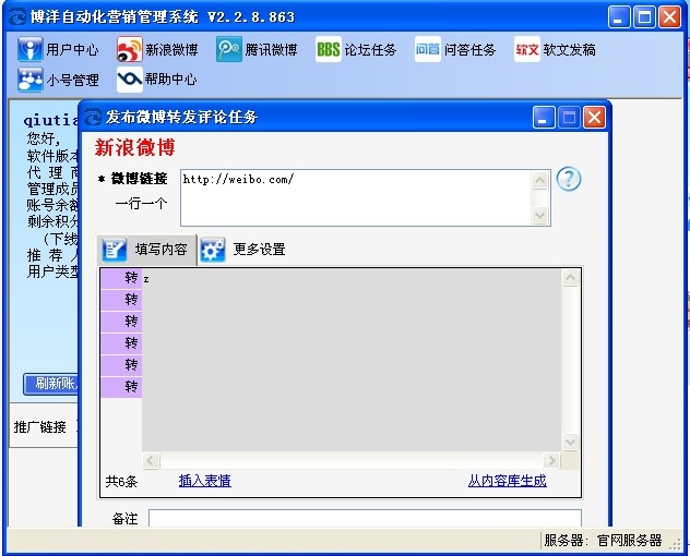 博洋微博營銷管理工具是適用于新浪微博、騰訊微博的一款輔助工具。軟件頁面簡潔、功能強(qiáng)大。它支持微博關(guān)鍵詞搜索營銷、客戶關(guān)系管理、微博用戶追蹤、官方微博管理等等。使用博洋全自動(dòng)新浪騰訊微博轉(zhuǎn)發(fā)評論軟件輕松幫你打造人氣微博。