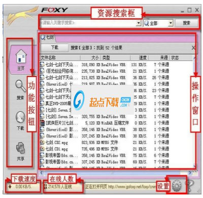 第二分鐘 找到資源。設(shè)置完成后,點擊“確定”按鈕返回軟件主界面,點擊“搜索”按鈕,在“搜索”框中輸入要搜索的資源的關(guān)鍵字,并在“文件類型”框中選擇資源種類(Foxy將資源劃分為多個類型,如音頻、視頻、文檔等,選擇相應(yīng)的類型可以更快、更準(zhǔn)確地搜索出相關(guān)資源),點擊“搜索”按鈕,稍候就能得出搜索結(jié)果(如圖3)。搜索結(jié)果顯示在窗口中,并能以文件的大小、類型、當(dāng)前下載速度和可連接的資源數(shù)等方式排序,點擊相應(yīng)的信息欄按鈕,可以按指定條件重新排列資源列表,方便初學(xué)的朋友在眾多資源中快速找到合適的資源。