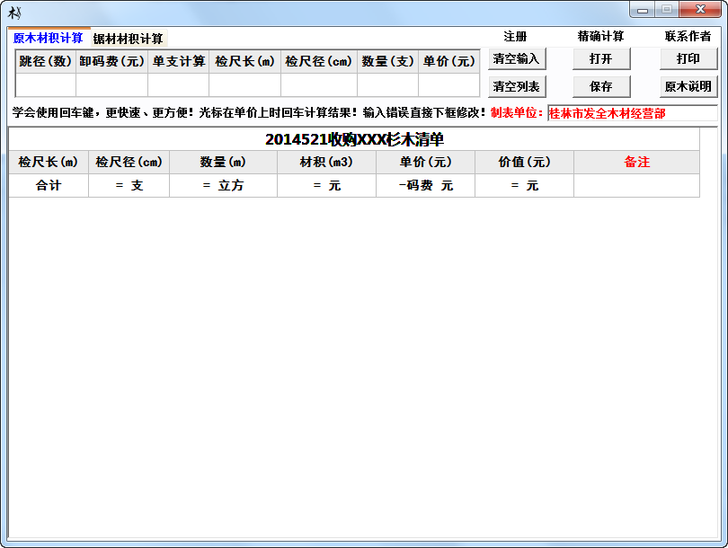 1、本軟件僅適用于計(jì)算檢尺長(zhǎng)2~10米,檢尺徑4CM以上和單支/元的計(jì)算;2、本軟件計(jì)算價(jià)格最適合做生意者使用;(因?yàn)楸拒浖?jì)算的價(jià)值全部是只保留整數(shù)即小數(shù)點(diǎn)后的數(shù)全部去掉);
