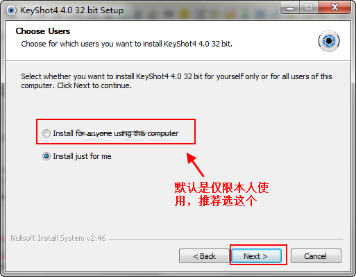 3、第一個選項是“安裝為所有用這臺電腦的人所用”,第二個選項是“僅僅安裝為我使用”,軟件安裝默認(rèn)僅本人使用,推薦選擇所有使用此計算機(jī)的人使用。