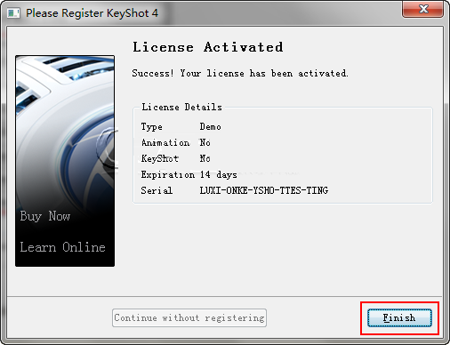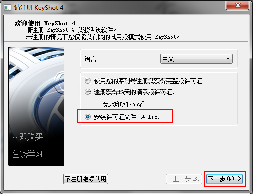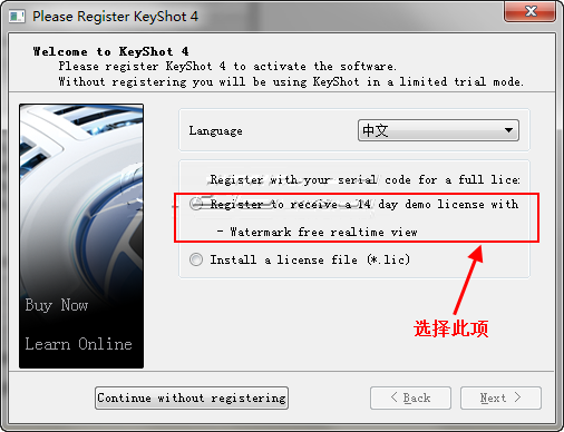 6、安裝好了之后單擊Finish。如果勾選了現(xiàn)在就運行keyshot4則軟件會自動打開。出現(xiàn)以下界面。選擇第二個選項,單擊NEXT。這里我們選擇免費使用14天。