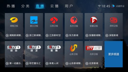 2、增加直播功能,各大電視臺24小時全天候直播。新增“直播”板塊,囊括中央臺全套、湖南衛(wèi)視、浙江衛(wèi)視、江蘇衛(wèi)視、北京衛(wèi)視、東方衛(wèi)視、廣東衛(wèi)視、廣東體育臺等100多個熱門電視頻道。據(jù)迅雷影音TV端產(chǎn)品團(tuán)隊透露,接下來的版本還會增加各大頻道的播放節(jié)目單和精彩節(jié)目回放功能。