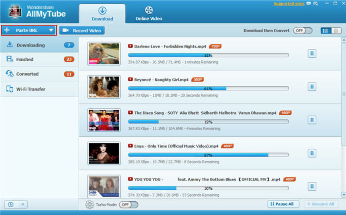 2) 或復制的每個視頻的 URL 并單擊+ 粘貼 URL的按鈕,在 AllMyTube 的"下載"界面中。