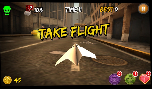 這款紙飛機(jī)的冒險(xiǎn)旅程PaperChase是一款采用了第一視角的跑酷類游戲,游戲模擬了大家小時(shí)候經(jīng)常玩的紙飛機(jī)游戲。游戲場景卻有些違和的選擇了大都市的街道,這架紙飛機(jī)飛出后,會(huì)像大部分跑酷游戲一樣走直線而不是紙飛機(jī)應(yīng)有的曲線。在這條直線上,會(huì)有金幣和各種獎(jiǎng)勵(lì)品,玩家需要左右、上下晃動(dòng)屏幕躲開信號(hào)燈、車輛等障礙物,然后盡可能在規(guī)定時(shí)間內(nèi)達(dá)到目的地。童年的時(shí)候折過紙飛機(jī)嗎?每次折好是不是都希望我們的飛機(jī)能夠飛得很遠(yuǎn)很遠(yuǎn)。現(xiàn)在,玩玩這款游戲吧,它將找回我們童年的記憶。控制你的飛機(jī)穿梭于大街小巷吧,小心不要撞到墻了哦~