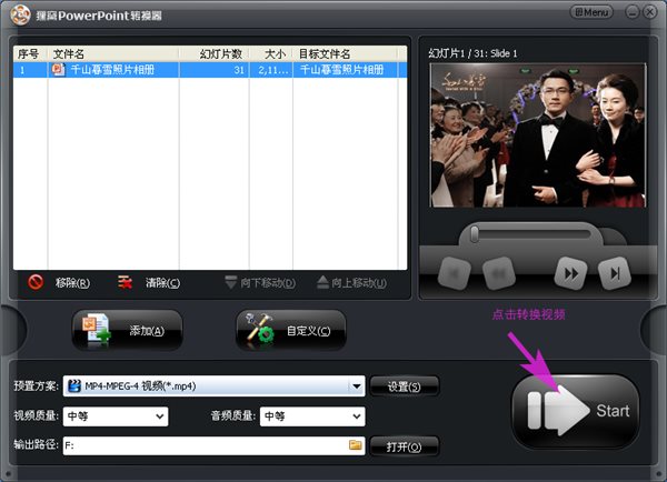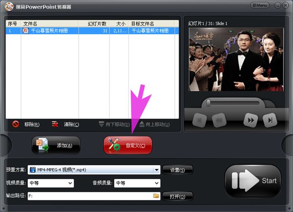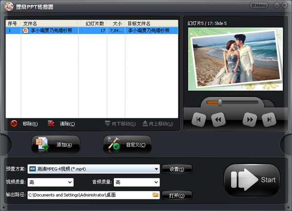 貍窩照片制作視頻軟件可把ppt格式幻燈片轉(zhuǎn)換為視頻格式。輸入PPT文件即可輸出格式為avi、wmv、mpeg、flv、mp4、vob、3gp、3g2、mov、ipod、iphone、psp、pmp、等的流行視頻格式。與其他的電子相冊(cè)制作軟件制作不同,貍窩照片制作視頻軟件不用規(guī)規(guī)矩矩單一的模板套用,應(yīng)用原理是利用PPT幻燈片的制作,將照片套用各種PPT背景圖片、不同的PPT模板,也可插入視頻跟字幕、水印和動(dòng)畫(huà),就可以輕松在家中擁有影樓級(jí)別的照片制作技術(shù)!把照片變成以音樂(lè)視頻形式呈現(xiàn)與人分享!