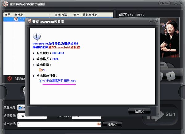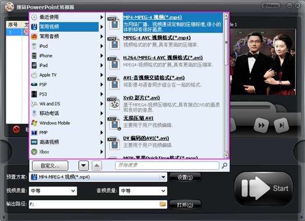 輸入格式:PPT、PPS輸出格式:3gp、mp4、avi、wmv、mpeg、flv、rmvb、mkv、asf、vob、3g2、mov、ipod、iphone、psp、等等常用流行視頻格式。