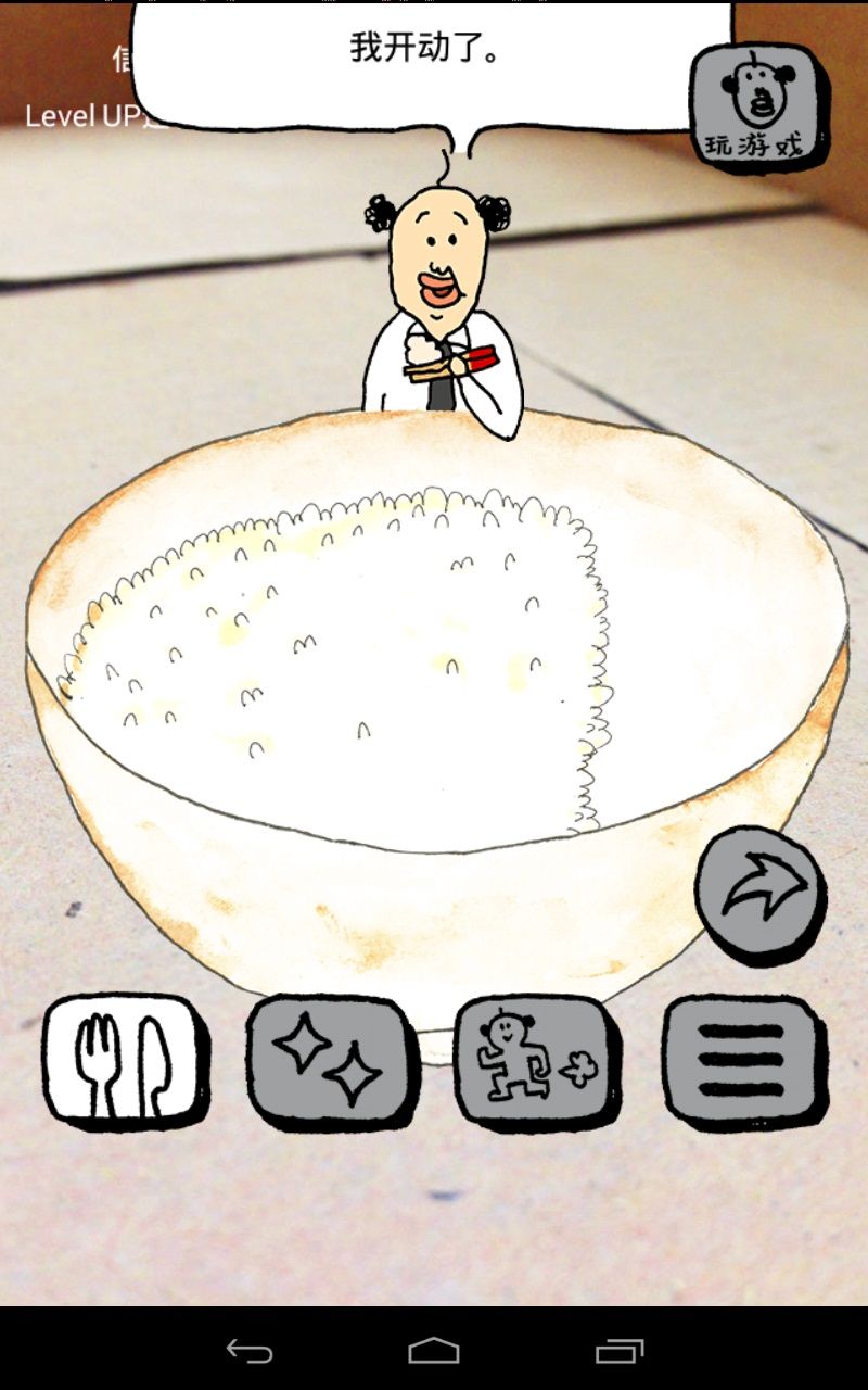 就像我們玩“養(yǎng)小倉(cāng)鼠”的游戲一樣,每天需要定時(shí)給迷你大叔提供食物。雖然大叔在性格設(shè)定上是“穩(wěn)重”,但是如果你忘記給他喂食,他可是會(huì)變得一蹶不振 喲。相反,一邊喂食還能一邊入手經(jīng)驗(yàn)值,并且還會(huì)提升他對(duì)你的依賴度。喂食的方法很簡(jiǎn)單,如下方第二章圖片顯示,只要從菜單模塊上選擇飯團(tuán)模樣的圖標(biāo)就可 以了。