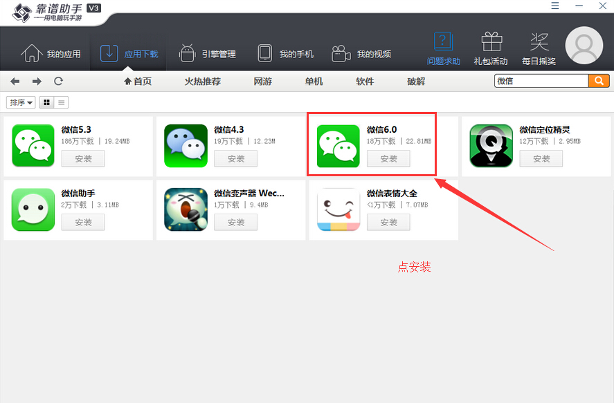 2.打開靠譜助手直接搜微信。然后選一個(gè)自已想安裝的版本,在此小編選最新版微信6.0,安裝過程有點(diǎn)慢,耐心等一會(huì)兒即可。微信安裝后點(diǎn)啟動(dòng)登錄就可以使用微信啦。