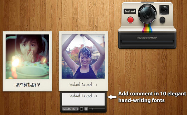 逼真并且有趣的界面設(shè)計。Instant模擬真實的寶麗萊即時相機(jī)的工作流程。你只要將照片拖拽到相機(jī)主窗口上, 然后“取景”, 點擊“拍攝”。一張寶麗萊即時成像相片就會從相機(jī)底部滑出來。30種老照片風(fēng)格濾鏡,其中有10種是經(jīng)典的寶麗萊風(fēng)格. 每個濾鏡都可以調(diào)節(jié)強(qiáng)度, 暗角, 乳膠和模糊效果。