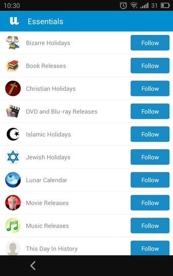 UpTo讓工作和生活都能通過這一個日歷應用來呈現(xiàn)和管理,所有你所關注的事情——從電影排期上映、學校籃球隊的比賽日程、劇集更新播放時間、各大科技公司年度峰會的日程,都可以在這個應用中找到并呈現(xiàn),用戶還可以有選擇地將這些事項加入到本人的日歷中去,用一個應用安排一天24小時內所有想要關注的事情。
