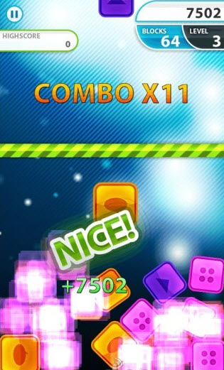 這以后,我們就盡量多的去選取這樣的黃色色塊吧,越多的的色塊,最后點擊消除我們的分?jǐn)?shù)才會更高。當(dāng)然啦,如果這時候不小心點到藍(lán)色塊,沒關(guān)系,再點擊一下就不會選中它啦~~