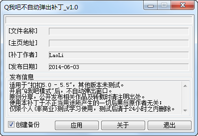 適用于QQ5.0 - QQ5.5,其他版本未測(cè)試。補(bǔ)丁后,Q我吧模式下不再自動(dòng)彈出窗口。另,對(duì)設(shè)置項(xiàng)中的“允許來(lái)消息時(shí)自動(dòng)彈出窗口”無(wú)影響。