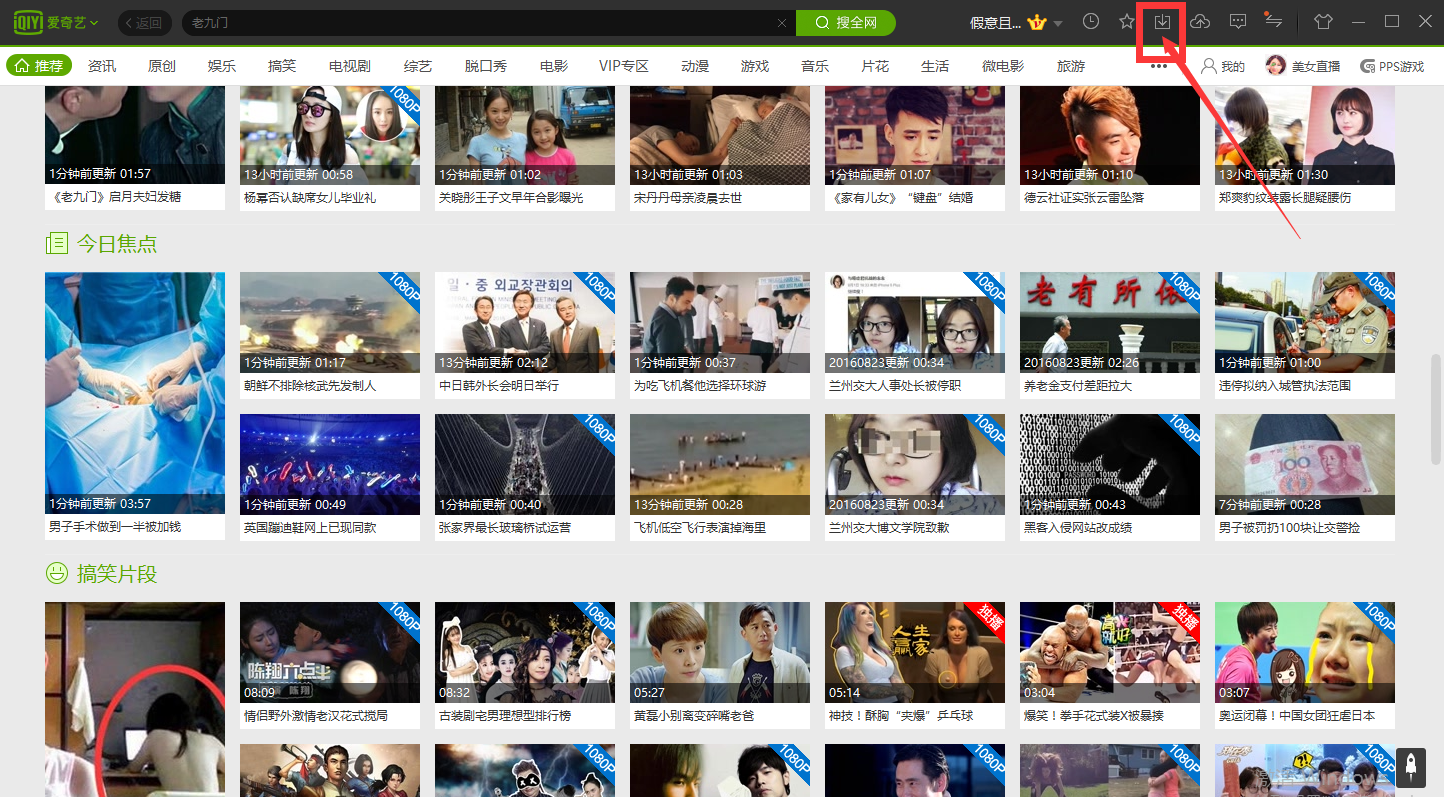 第一步、在電腦上下載并打開愛奇藝客戶端,點(diǎn)擊主界面右上方下載按鈕(如下圖紅框內(nèi))。