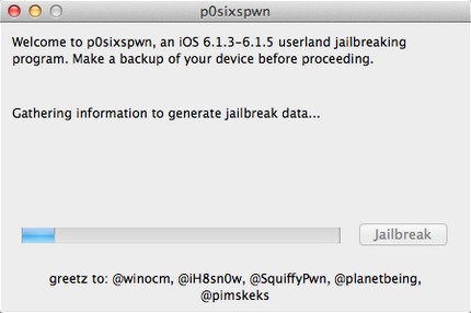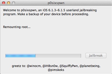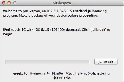 本次p0sixspwn mac版越獄工具不需要在iOS設(shè)備上操作,越獄過程請勿斷開設(shè)備連接。肥x經(jīng)測試:iPod Touch4 、iPod Touch5、iPhone 4(GSM) 6.1.3、6.1.5固件越獄暫沒發(fā)現(xiàn)問題。越獄過程大概需要10分鐘左右(與網(wǎng)絡(luò)環(huán)境相關(guān)),請耐心等待《p0sixspwn》提示完成。【使用方法】