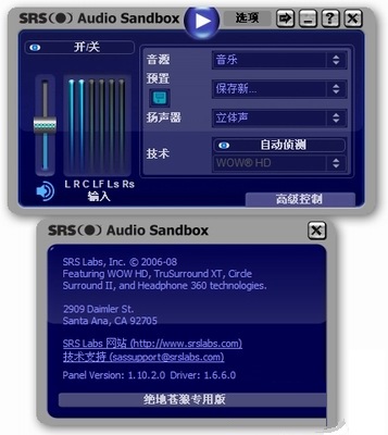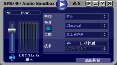SRS Audio Sandbox是一款專門為個人計算機音頻系統(tǒng)進行超級效果增強的軟件。 SRS虛擬環(huán)繞聲技術(shù)通過模擬環(huán)繞聲的聲音傳輸函數(shù),在雙聲道普通立體聲系統(tǒng)上提供了令人嘆為觀止的環(huán)繞音效、重低音音效,完美營造出不同環(huán)境的聲場,并專門針對普遍使用的2.1桌面揚聲器進行了從量到質(zhì)的優(yōu)化,效果非常明顯。它還特別針對音樂,音頻和游戲用戶定制了特殊的動感高、中、低、重低音加強效果音效預置,非常方便一般用戶的使用; 對于高級用戶還可以調(diào)出高級選項進行微調(diào),為你打造天籟般的音質(zhì),以達到滿意的效果。
